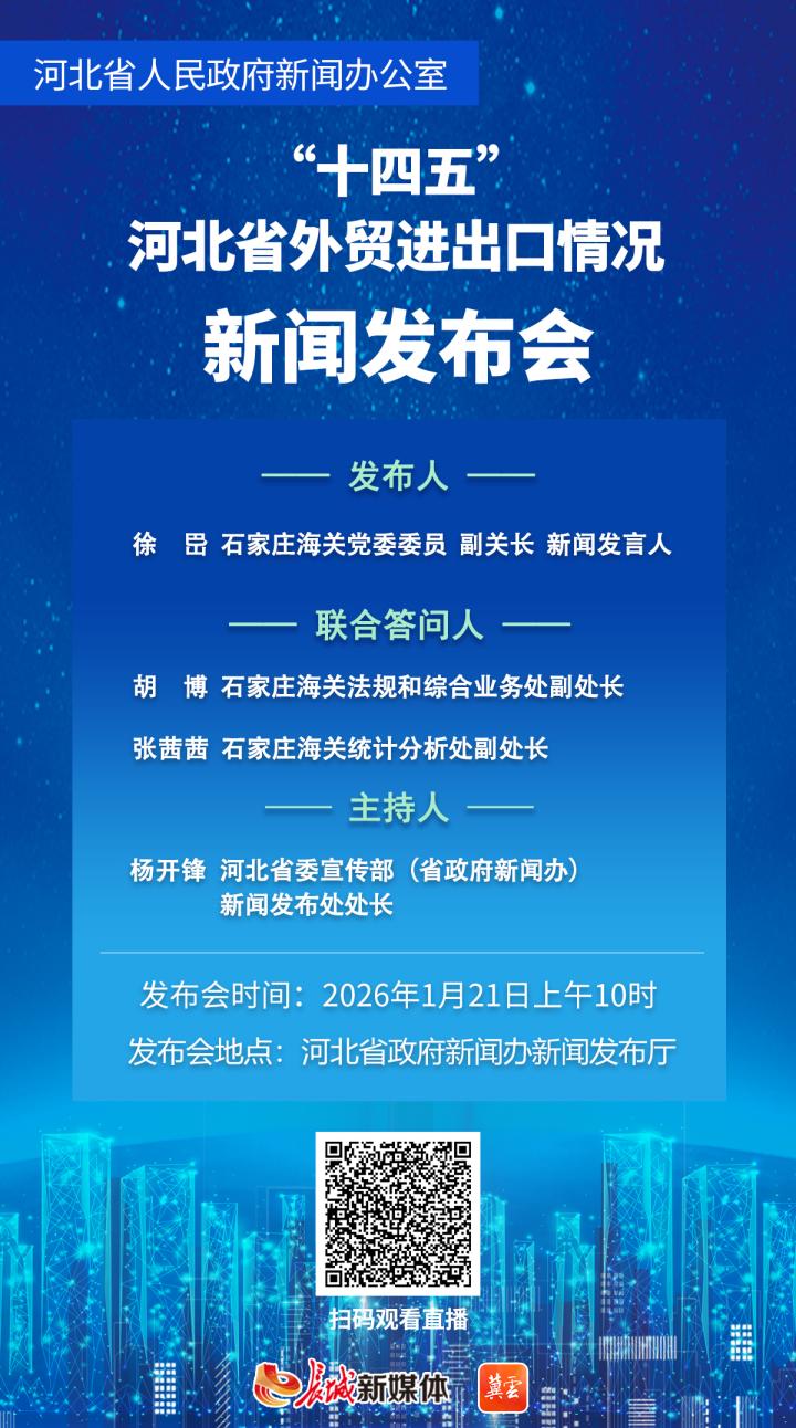 1月21日(星期三)10时,省政府新闻办将召开“‘十四五’河北省外贸进出口情况”新闻发布会。石家庄海关负责同志发布,并与石家庄海关相关处室负责同志共同回答记者提问。
