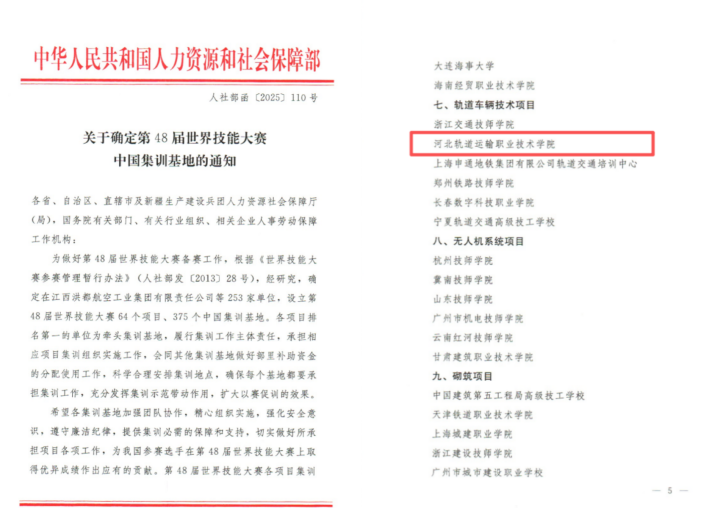 日前,河北轨道运输职业技术学院成功获批第48届世界技能大赛中国集训基地(轨道车辆技术),此次获批是学校锚定“双高”建设标准取得的又一里程碑式的重大历史性突破。基地将成为学校服务教育强国、交通强国战略,对接国际标准、培养顶尖高技能人才、推动职业教育改革与产业融合的核心平台。