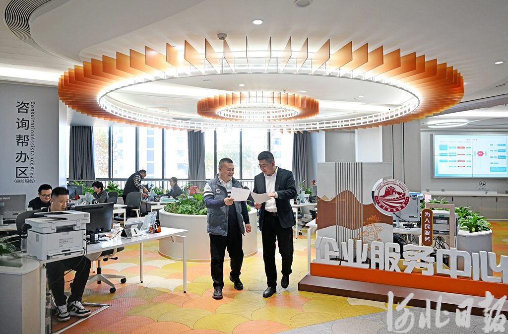 石家庄市政务服务中心工作人员(右一)为企业办事员服务。河北日报资料片