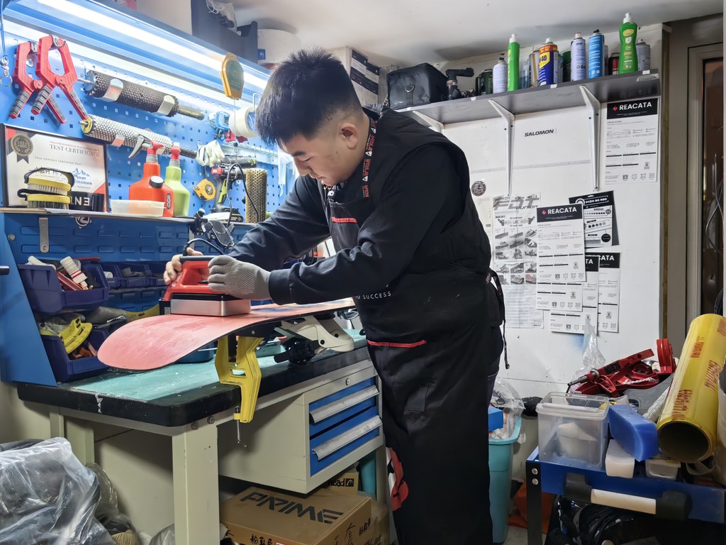 “底刃是雪板与雪具直接接触的关键部位,必须保养到位,刃要磨得锋利,蜡要打得均匀,这样滑起来才安全又顺畅。”米嘉轩说。