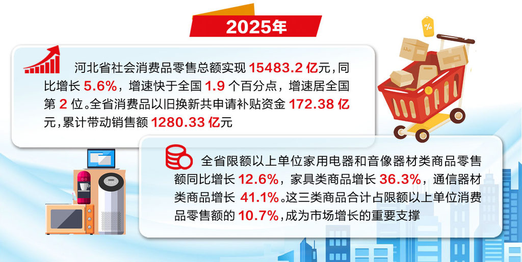 2025年,河北省社会消费品零售总额实现15483.2亿元,同比增长5.6%,增速快于全国1.9个百分点,增速居全国第2位。全省消费品以旧换新共申请补贴资金172.38亿元,累计带动销售额1280.33亿元。
