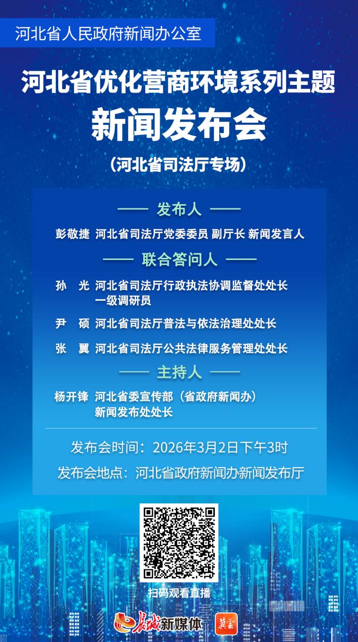 3月2日(星期一)下午3时,省政府新闻办将召开“优化营商环境”系列主题新闻发布会省司法厅专场。省司法厅相关负责同志发布,并与相关处室主要负责同志共同回答记者提问。