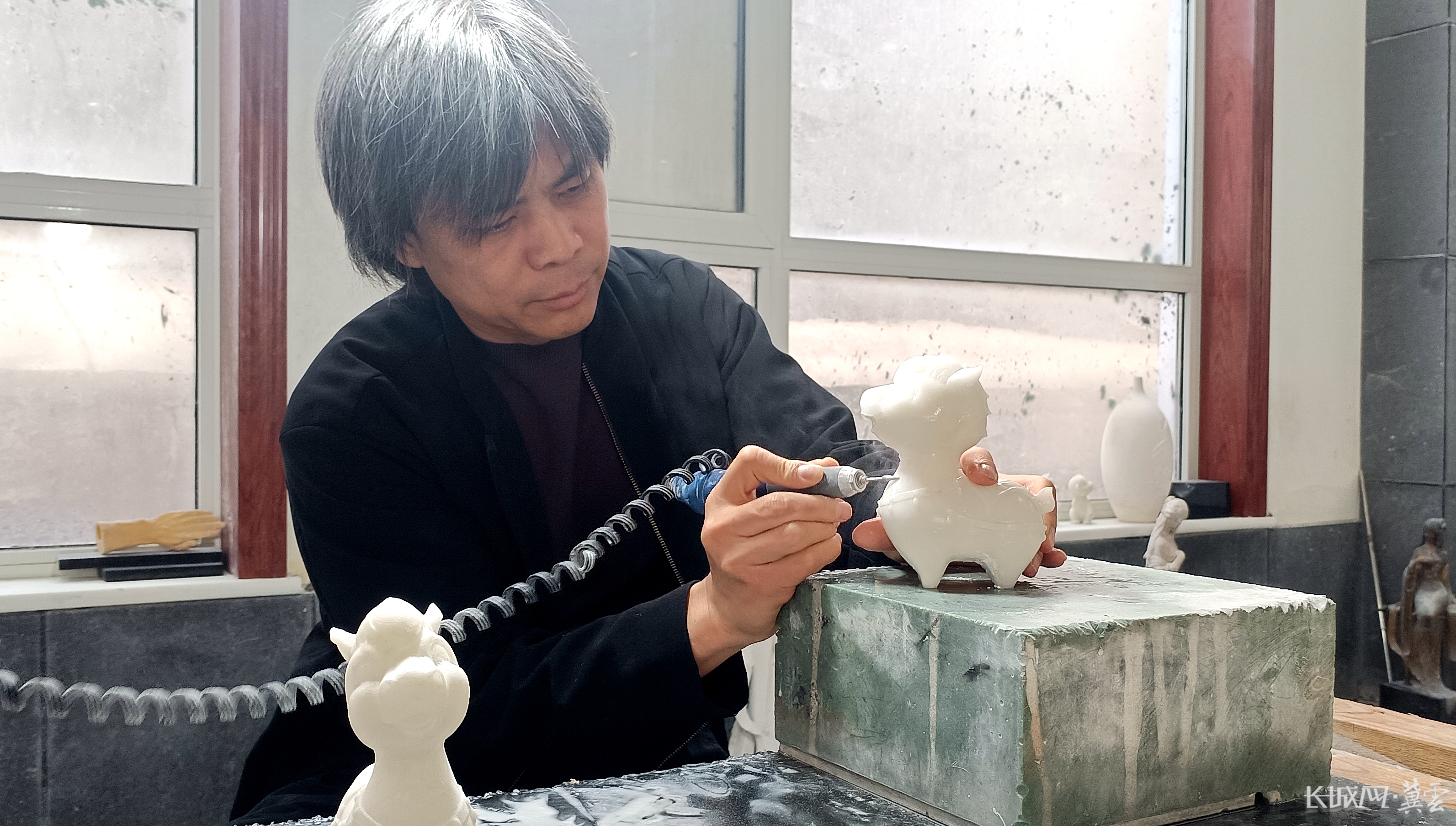 高英坡在工作室打磨石雕“萌马”。长城网·冀云客户端记者蔡洪坡 摄