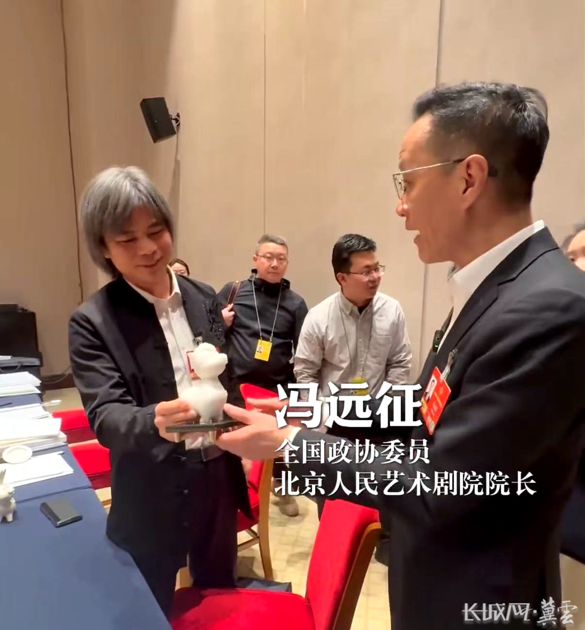 讲到紧要处,高英坡顺手从包里掏出两件文创作品——一件石雕马,一件定瓷兔,让大家更为直观地感受非遗活化利用的探索实践。这两件看上去萌态可掬的作品甫一亮相,就吸引了大家的眼球。会后,意犹未尽的委员们围拢过来,端详询问。甚至有委员,当场求赠送。全国政协委员、北京人民艺术剧院院长冯远征观赏石雕“萌马”后,啧啧称奇,爱不释手,直言:“很喜欢。”