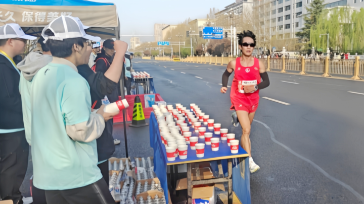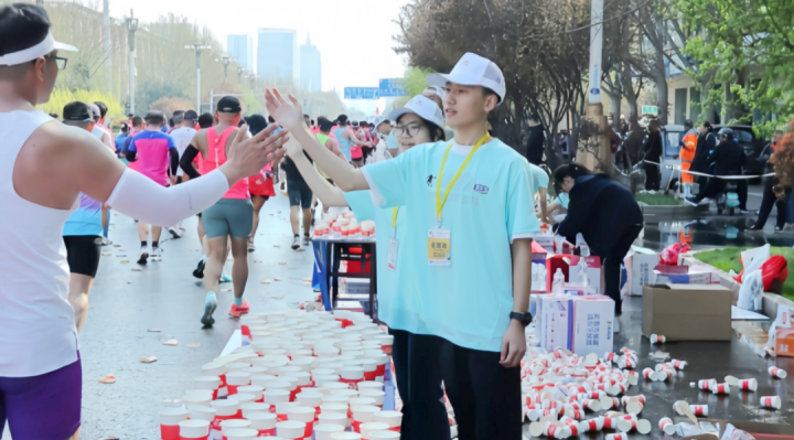 凌晨5:15,志愿者准时到岗,迅速投入工作,整齐码放饮用水、功能饮料,拆包摆放能量胶、香蕉等补给品,设置隔离带与指引标识。上午7:30发令枪响,跑者们涌入赛道,在长达6小时的连续工作中,志愿者不惧疲惫,始终坚守在工作岗位。