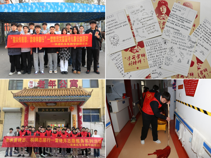 铁道机车车辆学院将雷锋精神与专业特色深度融合。面向留守儿童开展“指尖传善意,雷锋伴童行”活动,书写爱心明信片、录制暖心视频,以温情守护童心;志愿者走进敬老院和青少年活动中心开展义务清扫,之后在开发区校区实训基地开展常态化设备维护,将敬业奉献精神融入专业养成。