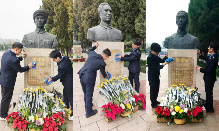 仪式结束后,师生们有序步入陵园内烈士纪念场馆及英雄事迹展区,感受先烈们滚烫的信仰与炽热的家国情怀。入党积极分子们俯身仔细擦拭纪念碑与墓碑感悟先烈浴血奋战的滚烫岁月。